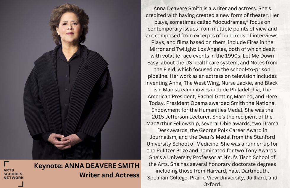 ABOUT ARTS SCHOOLS NETWORKArts Schools Network is just that ... a network ... a family of arts educators. A space to brainstorm, bounce ideas, problem solve and give/receive support. This network provides opportunities to become a stronger leader and improve arts schools and programs globally. | ABOUT THE CONFERENCE“Arts at the Forefront of Change,” the Arts Schools Network Annual Conference in October 2024, will explore the extraordinary power of storytelling in the 21st century -- the economy, policies, and politics driven by storytelling and the important role of the arts in shaping not only the culture of the nation and the globe but the future as well. Keynote speakers include Anna Deavere Smith and Jason Patera. |